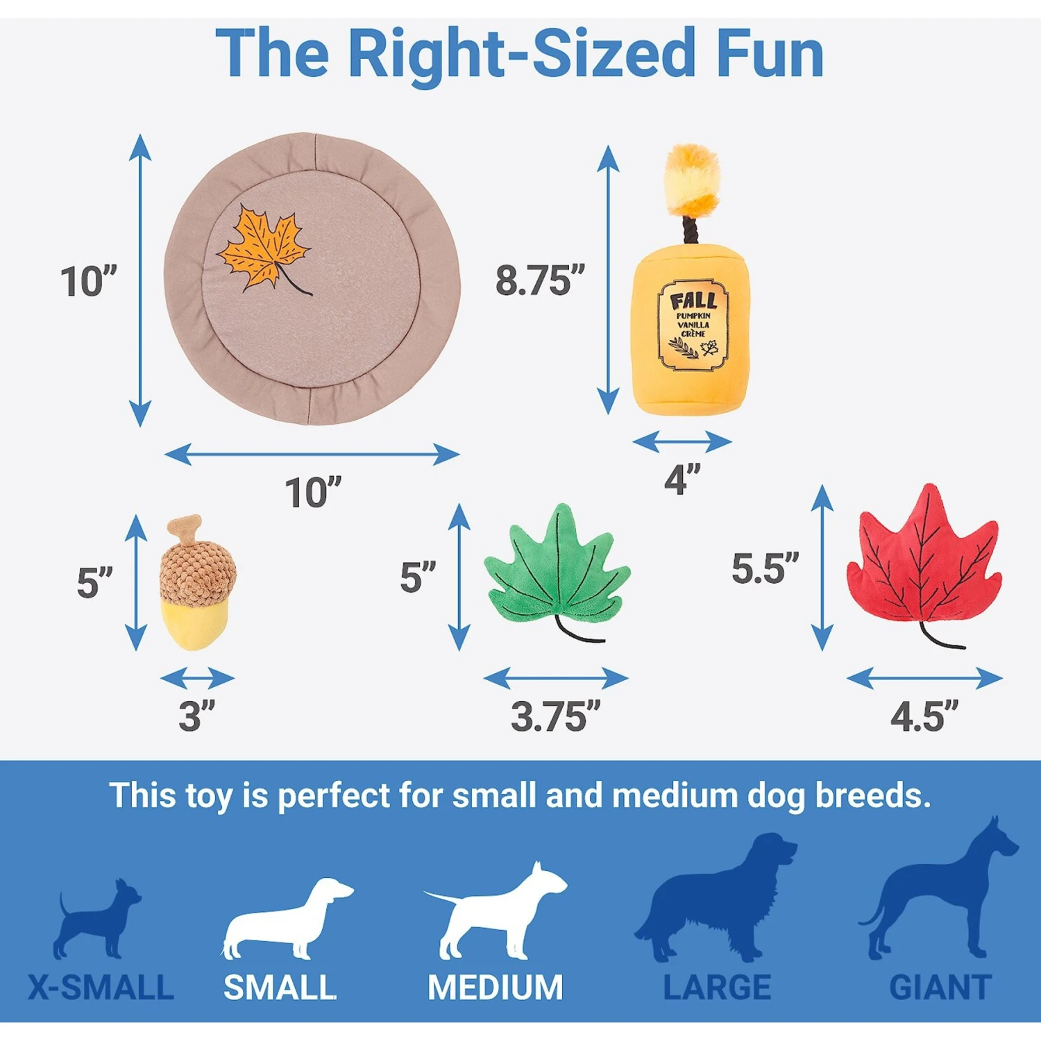 Bring the classic fall vibe to your bestie’s toy collection with this festive and fun interactive toy! This collection of plush toys comes with a candle charger base and four toys—a candle, an acorn and two fall leaves—to attach to it with hook-and-loop fasteners. Give these toys a squeaker or crinkle and watch your small or medium dog enjoy all the fall-themed fun!