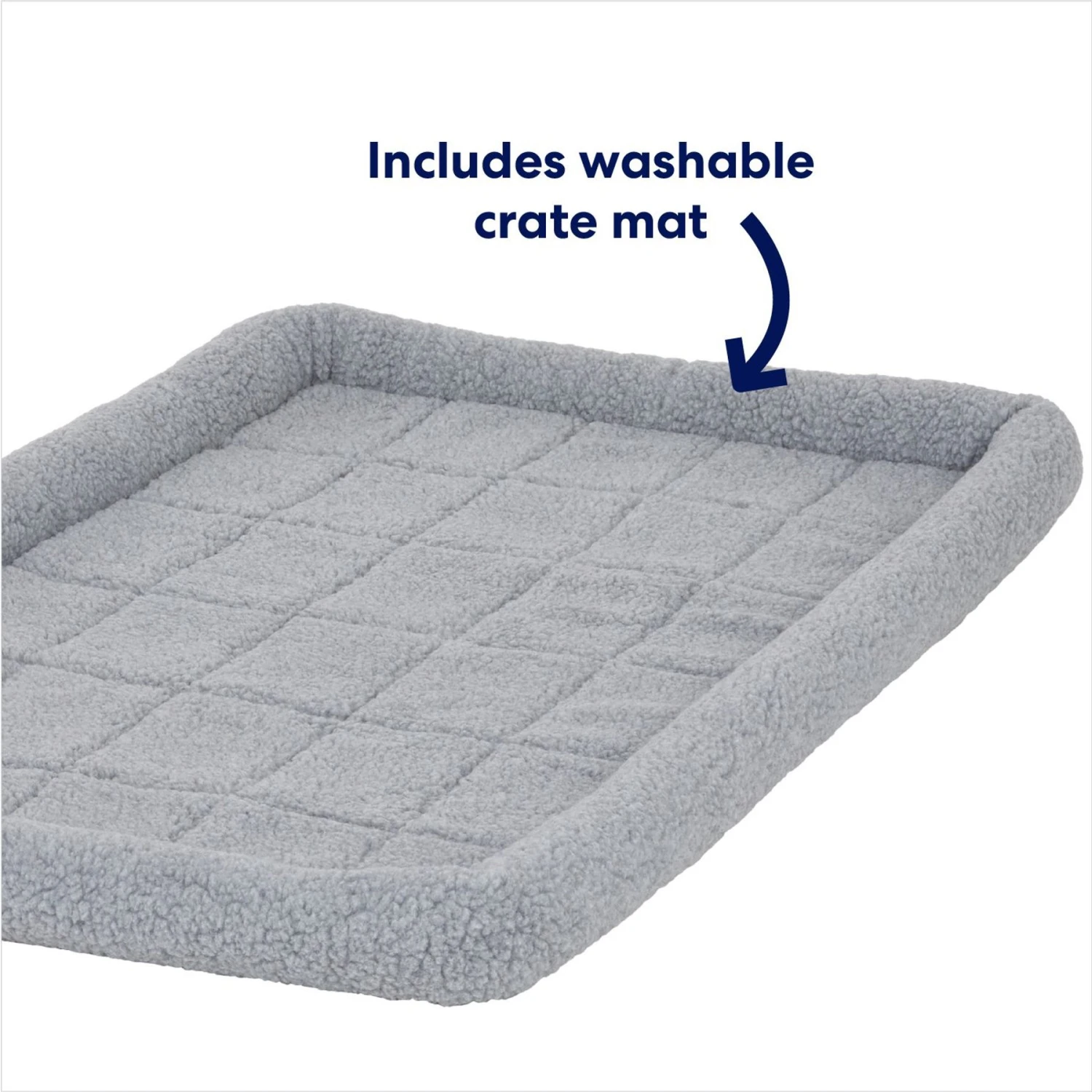 Give your pup a worthy, comfy castle with this fold-and-carry, double door dog crate and mat kit, from Frisco by Chewy. Complete with a comfortable mat, it’s a lounge zone for your pup while they stay safely contained. A protective, black electro-coat finish means it’s made to last, and a secure lock with dual latches adds peace of mind. The two doors make it easy for dogs to get in and out, and for you to place it in any spot in the house. An included divider panel allows you to create a smaller space for growing pups, and the removable base pan makes cleanup easy. Assembly is simple—no tools required! Plus, you can fold it flat with the adjustable handles, so you can bring it wherever your pup goes.